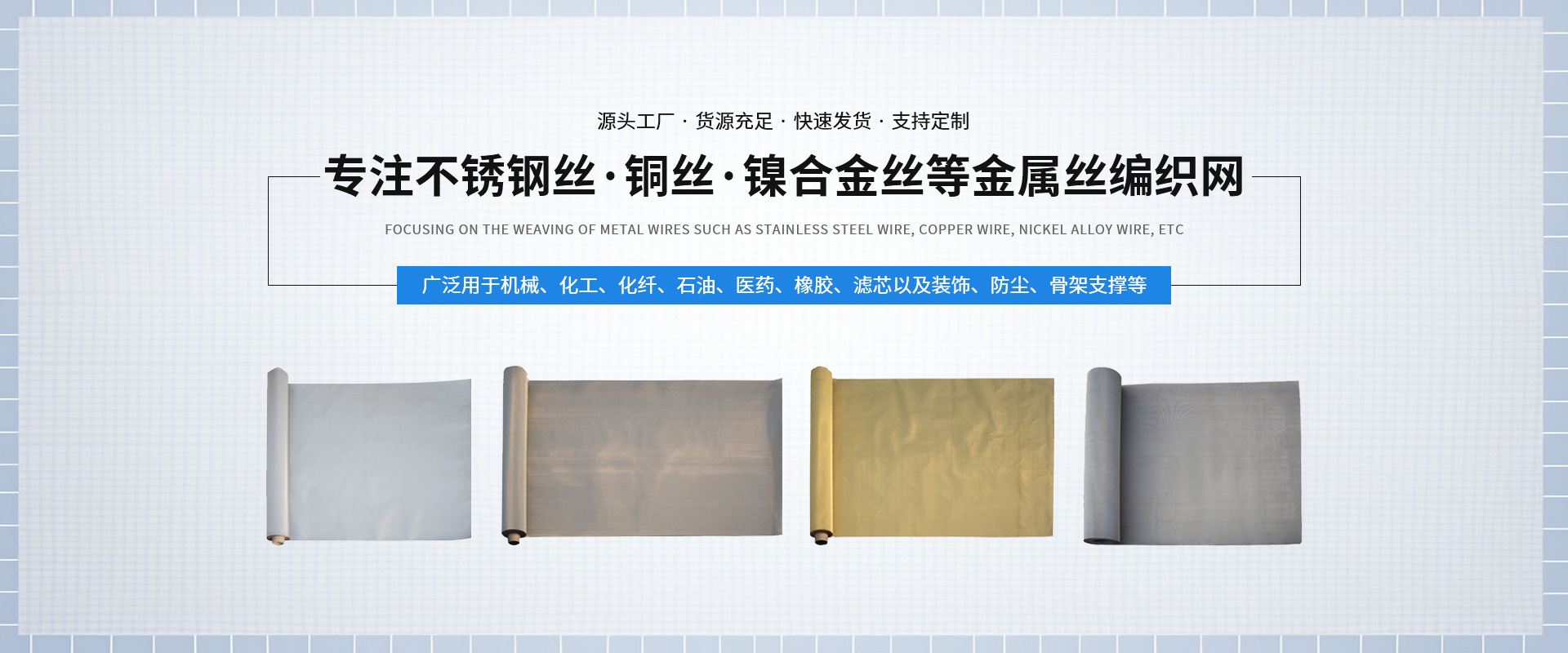 新鄉(xiāng)市中南金屬網(wǎng)有限公司成立于1999 年,公司設(shè)在河南省新鄉(xiāng)市。在過去的十幾年來,我們堅(jiān)持以嚴(yán)格的管理措施、雄厚的技術(shù)力量、良好的工藝設(shè)施,質(zhì)量上乘、信譽(yù)為上為原則,把樹立良好的企業(yè)形象為工作宗旨,歷經(jīng)市場(chǎng)的嚴(yán)峻考驗(yàn)并贏得廣大用戶的一致好評(píng)。金屬絲網(wǎng)編織結(jié)構(gòu)形式有平紋和斜紋兩種方法,嚴(yán)格按照航空軍品標(biāo)準(zhǔn)HB1862—93和標(biāo)準(zhǔn)GB/T5330—2003標(biāo)準(zhǔn),并等效采用國際標(biāo)準(zhǔn)ISO9044—90標(biāo)準(zhǔn)組織生產(chǎn)。 公司擁有生產(chǎn)設(shè)備和技術(shù)人員,主要生產(chǎn)不銹鋼篩網(wǎng)、磨料網(wǎng)、金屬絲編織方孔網(wǎng)、篩網(wǎng)、濾網(wǎng) 、篩分網(wǎng) 、過濾網(wǎng)、不銹鋼網(wǎng)、絲網(wǎng)、金屬絲網(wǎng)、金屬絲編織密紋網(wǎng)、特種網(wǎng)、不銹鋼密紋網(wǎng)、荷蘭網(wǎng)、席型網(wǎng)。絲網(wǎng)材質(zhì)選用黃銅、錫青銅、不銹鋼、純鎳等。席型網(wǎng)規(guī)格7/44目—500/3500目,方孔網(wǎng)規(guī)格1/2目—500目,網(wǎng)孔25mm—0.028mm,產(chǎn)品廣泛用于機(jī)械、化工、化纖、石油、醫(yī)藥、橡膠、濾芯、固體果粒篩分、流體過濾以及裝飾、防塵、骨架支撐等。 我們以“視質(zhì)量為生命、以信譽(yù)求生存、以科技促發(fā)展、以優(yōu)*產(chǎn)品為客戶服務(wù)”的經(jīng)營理念,真誠的希望與各界人士攜手并進(jìn),共創(chuàng)輝煌!